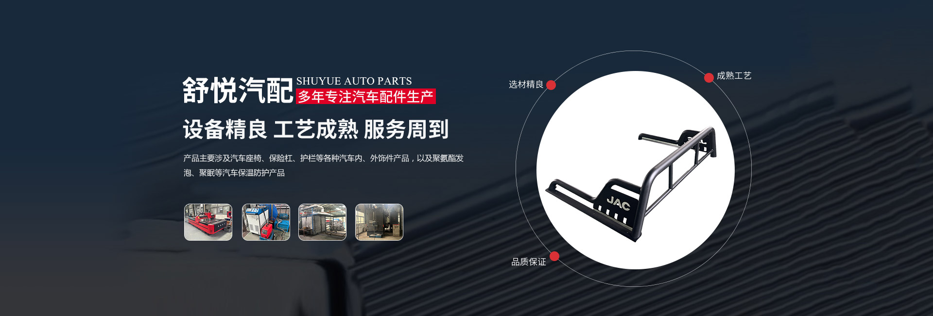 揚州舒悅汽配有限公司經(jīng)過多年的穩(wěn)定發(fā)展,業(yè)績一直蒸蒸日上。公司產(chǎn)品主要涉及汽車座椅、保險杠、護欄等各種汽車內(nèi)、外飾件產(chǎn)品,以及聚氨酯發(fā)泡、聚脲等汽車保溫防護產(chǎn)品。其主要是為江淮、金龍,奇瑞等公司服務,已連續(xù)多年成為江淮、金龍等公司的A級供應商。        公司成立于1997年,現(xiàn)坐落于揚州市儀征劉集盤古工業(yè)集中區(qū)202號,公司占地面積26640平 方米,廠房建筑面積18512平方米。公司擁有先進的制造設備、可靠的生產(chǎn)工藝、完善的檢測手段和科學的管理,在售前和售后服務中做到快速反應,應急應變,為客戶提供優(yōu)良產(chǎn)品和滿意服務。公司的產(chǎn)品開發(fā)能力和生產(chǎn)規(guī)模在同行業(yè)中處于前列的地位。        揚州舒悅人秉承“誠信雙嬴”的原則,發(fā)揚“誠信、務實、創(chuàng)新、貢獻”的企業(yè)精神,恪守“顧客至上”的經(jīng)營宗旨,致精從業(yè),不斷引進新技術、新材料。以優(yōu)良的產(chǎn)品、合理的價格和周到的服務參與市場競爭。公司愿與國內(nèi)外朋友建立真誠的合作伙伴關系,攜手共創(chuàng)輝煌!